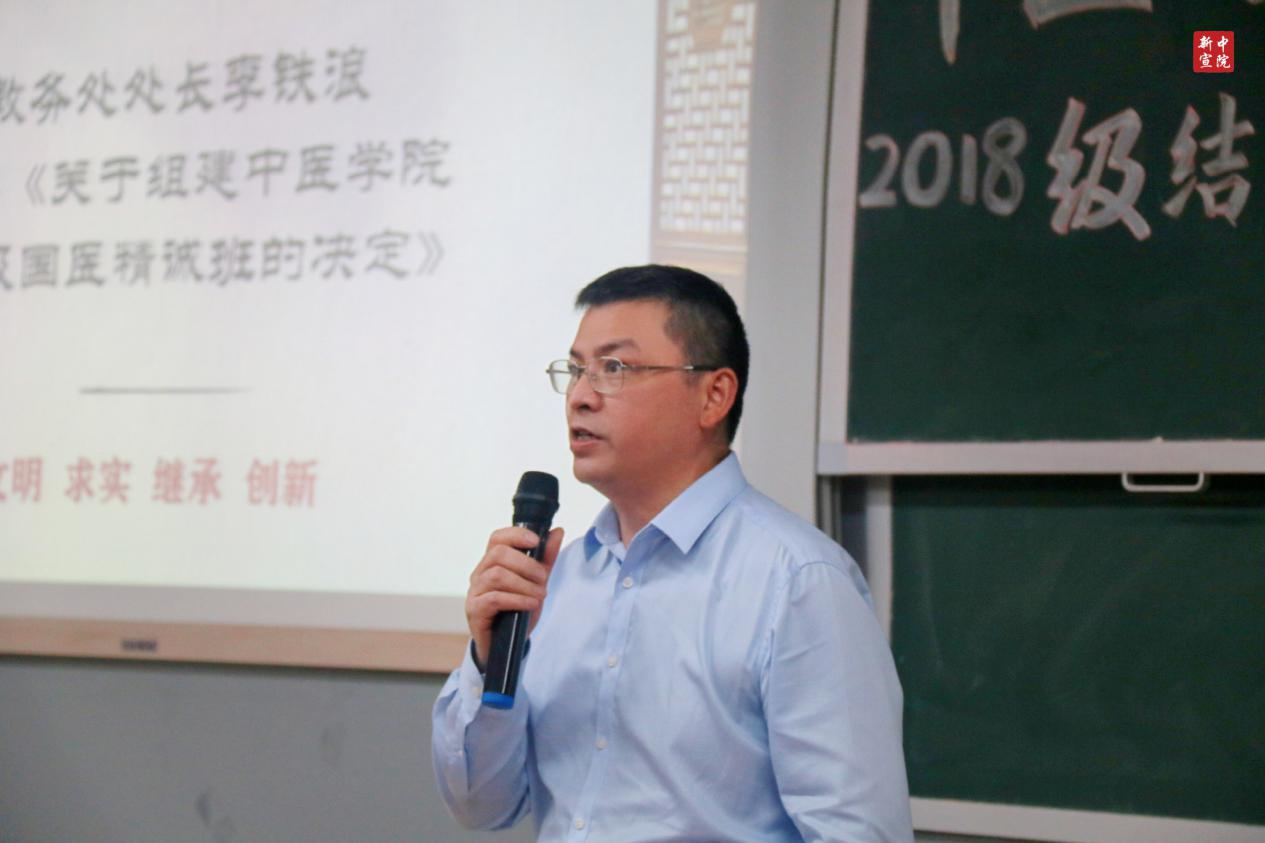 李铁浪宣读《关于组建皇冠9393体育平台2021级国医精诚班的决定》,宣布2021级国医精诚班顺利开班。