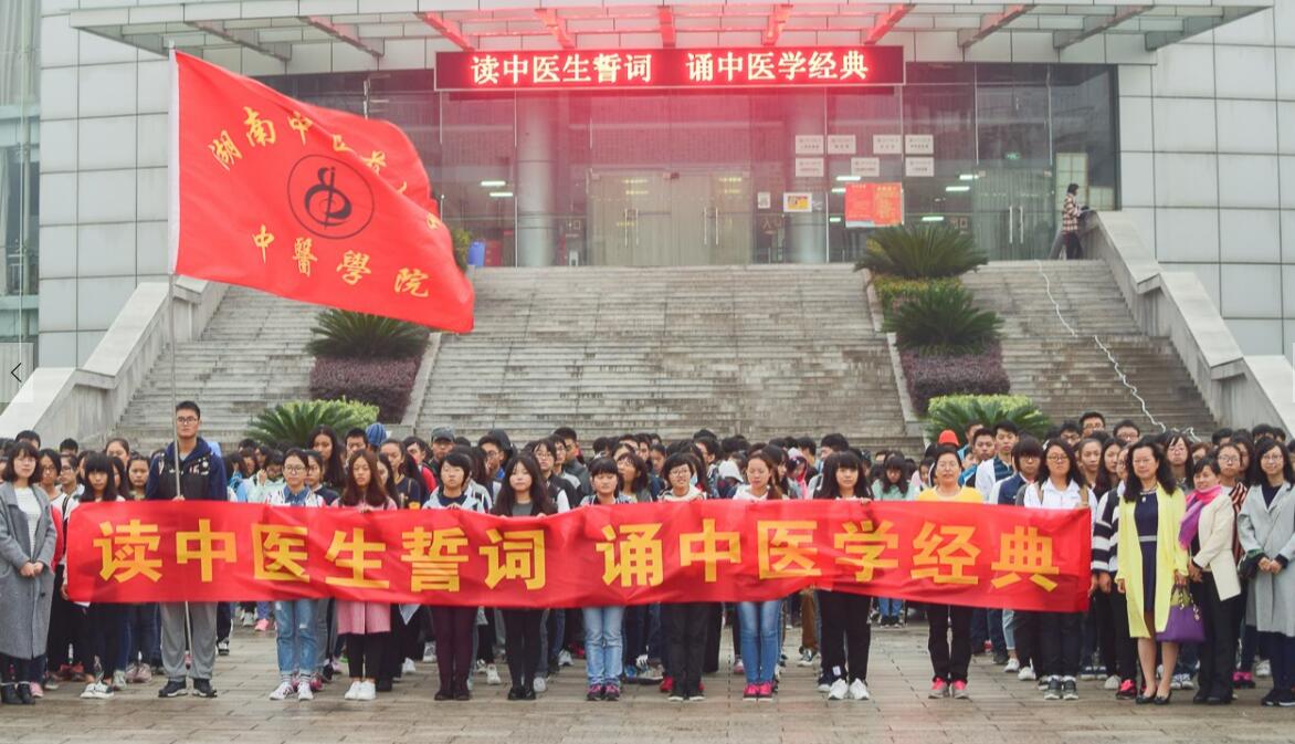 伴着丝丝细雨,启动仪式正式开始。首先,李晓红对中医经典诵读活动进行宣讲动员,阐述了晨读的重要性,寄语同学要珍惜年少时光、发奋图强。随后,叶利军致辞并宣读中医生誓词征集活动获奖者名单。仪式最后,皇冠9393体育平台16级全体同学在学生代表李宇盾同学的领誓下,共同诵读中医生誓词并许下誓言:不负师恩,不负梦想,继承经典,悬壶济世。